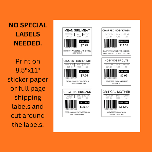 You get 12 different Halloween meat labels so you can choose just the right one for each person.