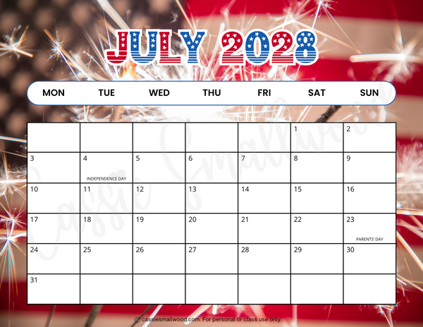 - Printable July 2028 calendar with holidays and American flag and sparklers background